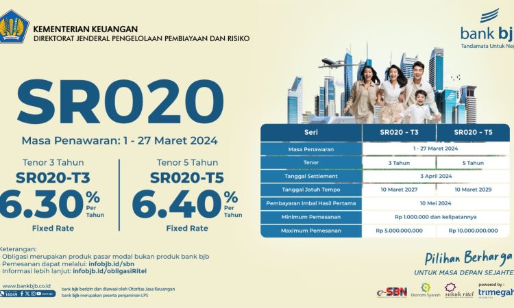 Bandung, bandungpos.id — Pemerintah resmi menerbitkan Sukuk Ritel seri SR020 dengan masa penawaran yang berlangsung pada tanggal 1-27 Maret 2024.
