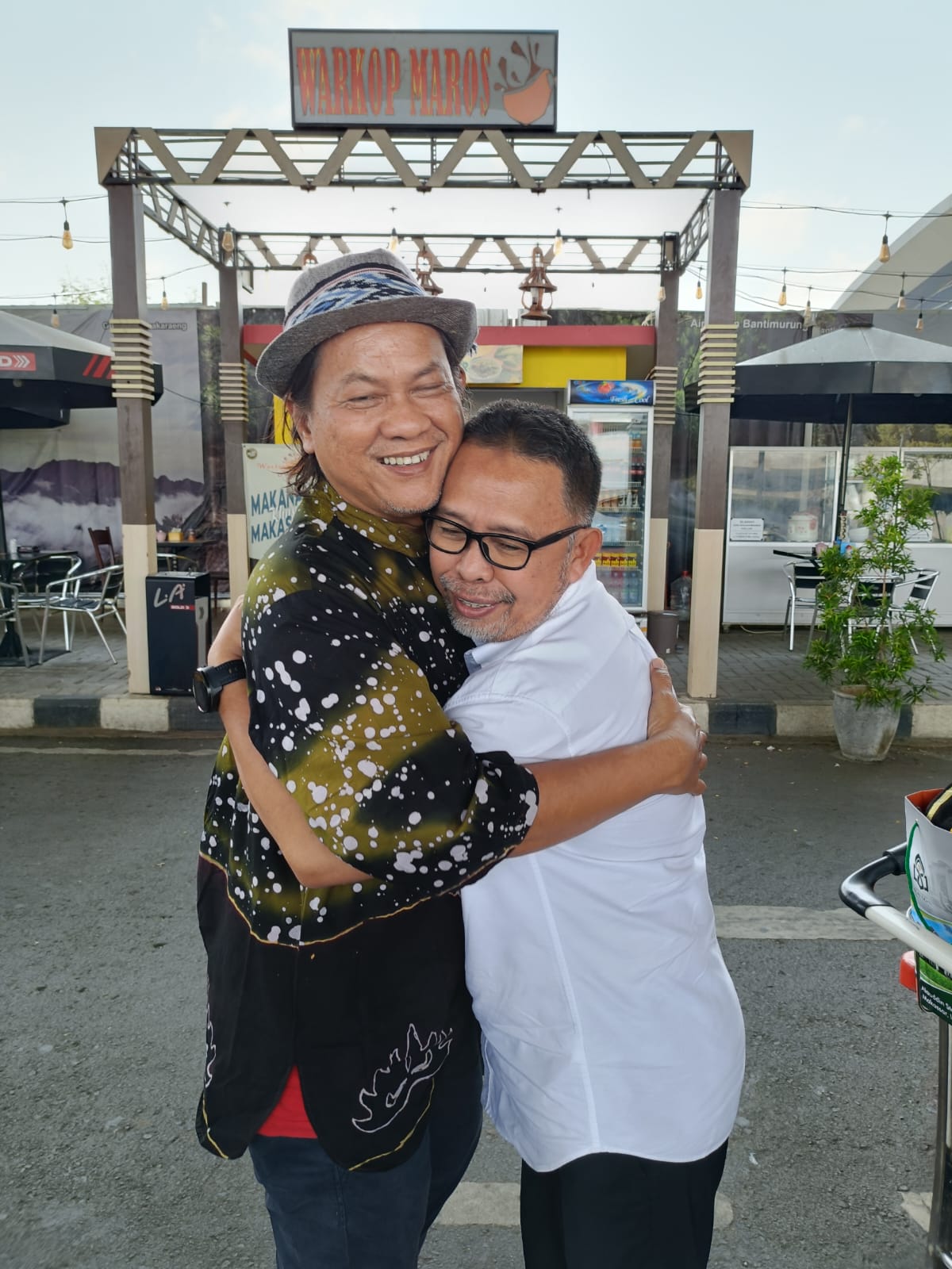 Berpelukan, Duo Penggiat Literasi, Bachtiar Adnan Kusuma dan Gol A Gong melakukan selebrasi Pelukan Literasi di ajang Temu Empat Tokoh Penghargaan Tertinggi Nugra Jasadharma Pustaloka Perpustakaan di Kota Maros. Foto: Dok.BAK/BNN