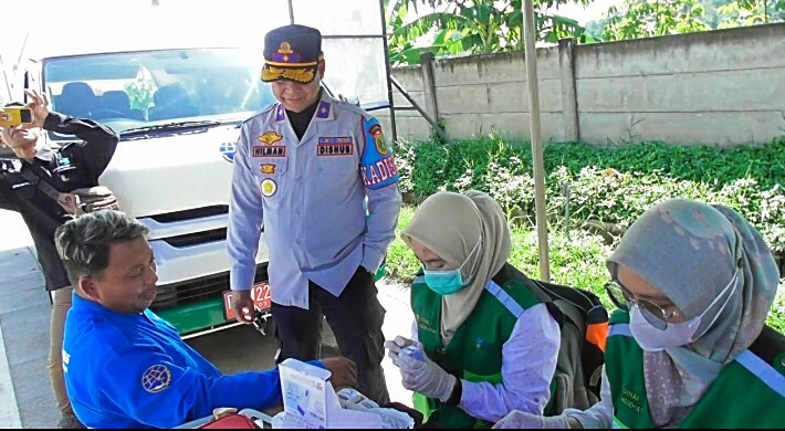 Selain ram cek, petugas juga memeriksa kesehatan awak kendaraan para supir dan kondektur bus. Pemeriksaan dilakukan oleh petugas kesehatan Kabupaten Bandung.