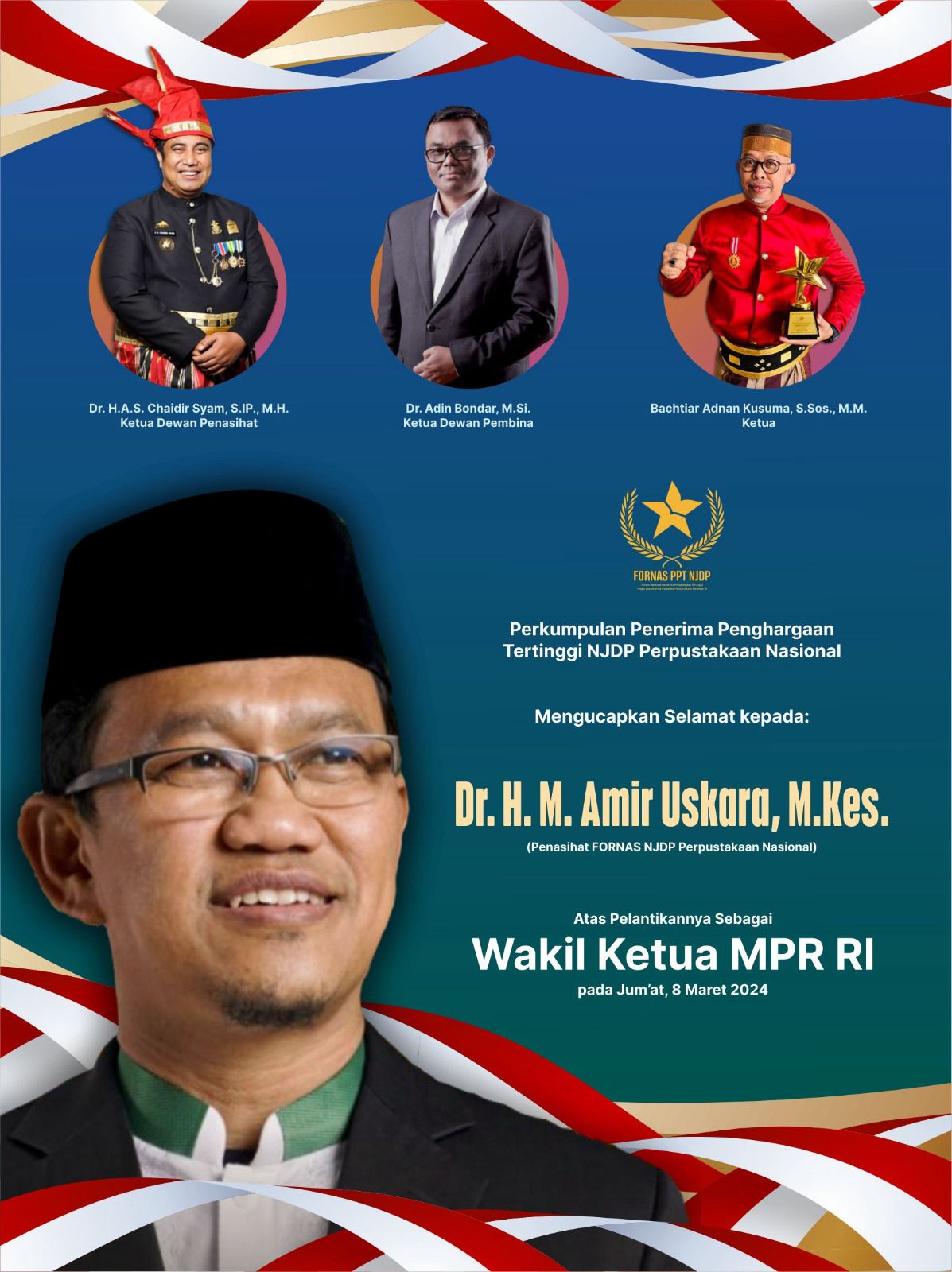 Sementara itu, Dewan Pembina Penerima NJDP Perpustakaan Nasional Dr.Adin Bondar, M.Si. Ikut memberi selamat. Dan, Bachtiar Adnan Kusuma, ketua pendiri Perkumpulan Penerima Penghargaan Tertinggi NJD Pustaloka, menyampaikan rasa syukur dan bangga karena Dr.H.M.Amir Uskara diberi amanah sebagai Wakil Ketua MPR RI. Artinya, kata Tokoh Literasi ini, Dr.H.M.Amir Uskara adalah putra terbaik Sulsel di panggung politik nasional. Kami bangga dan bersyukur karena selain Kak Dr.H.M.Amir Uskara menjabat Wakil Ketua MPR RI juga mantan Gubernur Sulsel penggagas konsep Tri Konsepsi, Prof.Dr.Achmad Amiruddin Pabittei pernah menjabat Wakil Ketua MPR RI pada 1992.