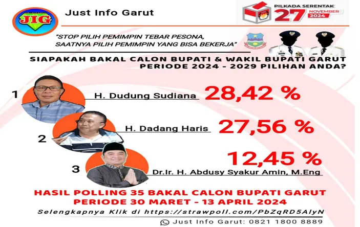 Berikut ini hasil lengkap perolehan suara dari polling JIG tersebut dari Periode 30 Maret – 13 April 2024: di Puncak ada H. Dudung Sudiana – Pengusaha Pituin Garut. 28,42 % ( 1.821 suara) H. Dadang Haris – Pengusaha Properti. 27,56 % ( 1.766 suara) Dr.Ir. H. Abdusy Syakur Amin, M.Eng – Tokoh Masyarakat Garut.12,45 % ( 798 suara) H. Aji Muhammad Iqbal – Ketua STAI KH. BADRUZZAMAN Tijani 7,4 % ( 474 suara) Dr. Hilman Umar Basori – Tokoh Muda NU/ Ketua LP Maarif/ Ketua STIEBS NU Garut. 5,59 % ( 358 suara) Dr. H. Nadiman – Anggota DPRD Garut Partai Golkar Periode 2019 – 2024. 4,43 % ( 284 suara) Agus Rustandi – Kepala BP PEMILU DPD PDI Perjuangan Jawa Barat. 3,37 % ( 216 suara) dr. Helmi Budiman – Ketua DPD PKS Kab. Garut. 1,95 % ( 125 suara) H.ACENG RONI SYAHBANA. S.PD., M.SI., AIFO – MANTAN DPRD PROV JABAR – WASEKJEND KAHMI NASIONAL – KONI PROV JABAR. 1,47 % ( 94 suara) Dicky Candra – Mantan Wakil Bupati Garut. 0,89 % ( 57 suara) Hasanuddin, SH – Kader Partai Gerindra. 0,86 % ( 55 suara) Dr.Ir. H. Ugan Djuanda, MPDA – Ketua Inkindo Jabar – Ketua HAMKI DPD Jabar – Pengurus Kadin Jabar – Bendahara Himpunan Ahli Teknik Hidrolika Jabar. 0,67 % ( 43 suara) Dr. Ade Najmulloh – Tokoh Masyarakat Garut. 0,67 % ( 43 suara) H. Alan Partimbang – Tokoh Masyarakat Garut. 0,55 % ( 35 suara) Widi Nugroho – Kader Partai Solidaritas Indonesia (PSI). 0,47 % ( 30 suara) H. Dadan Hidayatulloh, S.Ag., M.Ipol – Ketua DPC PKB Kab. Garut. 0,45 % ( 29 suara) H. Agus Supriadi, SH – Mantan Bupati Garut. 0,39 % ( 25 suara) Yudi Nugraha Lasminingrat – Ketua DPC PPP Garut. 0,31 % ( 20 suara) Mulan Jameela – Anggota DPR RI Partai Gerindra Dapil Jabar XI – Periode Terpilih Kembali 2024 – 2029. 0,25 % ( 16 suara) H.Aceng Hulik Munawar Fikri, S.Ag. – Mantan Bupati Garut. 0,23 % ( 15 suara) Ahmad Bajuri, SE, MM – Ketua BPOKK DPD Partai Demokrat Jawa Barat. 0,19 % ( 12 suara) Enan – Ketua DPC Partai Gerindra Kab. Garut. 0,19 % ( 12 suara) Hj. Intania Agus Hamdani – Anggota DPRD Garut – PPP Terpilih Periode 2024 – 2029. 0,17 % ( 11 suara) Hj. Imas Aan Ubudiah – Anggota DPR – RI PKB Dapil Jabar XI Terpilih Periode 2024 – 2029. 0,16 % ( 10 suara) H. Ade Ginanjar, S.Sos – Anggota DPR RI Partai Golkar Dapil Jabar XI Terpilih Periode 2024 – 2029.0,16 % ( 10 suara) Yuda Puja Turnawan – Ketua DPC PDI Perjuangan Kab. Garut. 0,16 % ( 10 suara) H. Iman Alirahman, SH, M.Si – Wakil Ketua DPD Partai Golkar Jawa Barat. 0,11 % ( 7 suara) H. Ahab Sihabudin, SHI – Anggota DPRD Jabar F – PKS Dapil 14. Periode 2019 – 2024 – 2024 – 2029. 0,09 % ( 6 suara) Dra. Hj. Euis Ida Wartiah, M.Si – Ketua DPD Partai Golkar Kab. Garut. 0,09 % ( 6 suara) Hj. Diah Kurniasari – Ketua DPD Nasdem Kab. Garut. 0,09 % ( 6 suara) Deden Galih, SH, MM – Anggota DPRD Jabar F-Gerindra Dapil 14. Periode 2019 – 2024. 0,06 % ( 4 suara) Jalan. H. Aas Kosasih, SAg, MSi – Mantan Anggota DPRD – Mantan Ketua Baznas Kab. Garut – Ketua Mustasyar Dewan Masjid Indonesia DMI Garut. 0,05 % ( 3 suara) H. Enjang Tedi, M.Sos, – Anggota DPRD Jabar 14 – Partai Amanat Nasional (PAN). 0,05 % ( 3 suara) H. Raden Marlan – Pengurus DPC PPP Kab. Garut. 0,03 % ( 2 suara) Jalan. H Holil Aksan – Fungsionaris Partai Golkar.0,03 % ( 2 suara) Jumlah suara: 6.408 Data Asli Hasil Vote Klik di https://strawpoll.com/PbZqRD5AlyN. **(BNN)