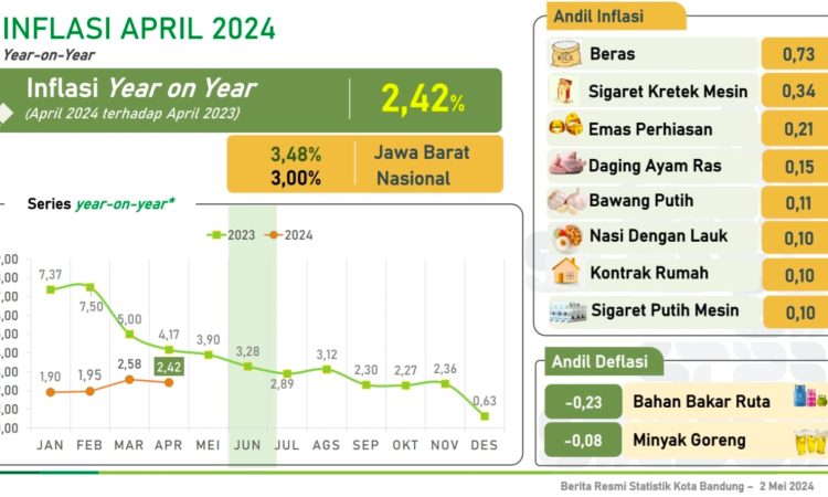 Bandung, bandungpos.id –Berdasar rilis Badan Pusat Statistik (BPS) Kota Bandung, Perkembangan Indeks Harga Konsumen Kota Bandung April 2024, inflasi Year on Year (YoU) Kota Bandung terendah di Jawa Barat.