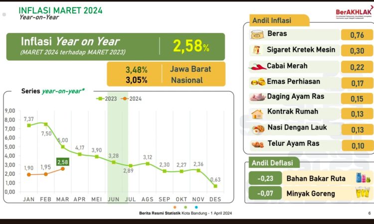 Bandung, bandungpos.id — Badan Pusat Statistik (BPS) Kota Bandung merilis Perkembangan Indeks Harga Konsumen Kota Bandung Maret 2024. Hasilnya, pada Maret 2024 terjadi inflasi Year on Year (YoU) Kota Bandung sebesar 2,58 persen dengan Indeks Harga Konsumen (IHK) sebesar 105,98.