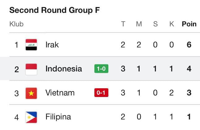 Tiga poin perdana ini membawa Indonesia naik ke posisi kedua klasemen sementara Grup F dengan empat poin, selisih dua poin dari Irak di posisi puncak.