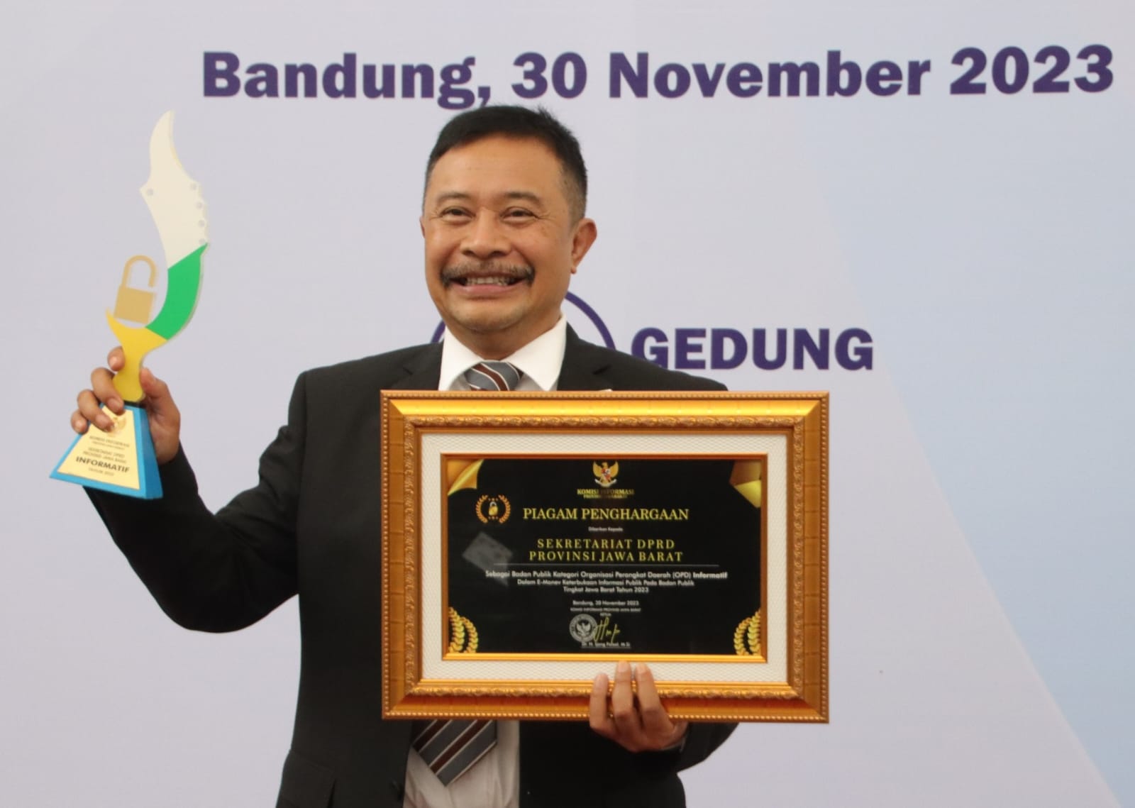 Penghargaan Keterbukaan Informasi Publik tahun 2023, yang diberikan kepada Sekretariat DPRD Provinsi Jawa Barat,itu diberikan langsung oleh Pj Gubernur Jabar,Bey Machmudin kepada Sekretaris DPRD Provinsi Jawa Barat,Barnas Adjidin, di aula barat Gedung Sate,Kota Bandung,Kamis (30/11/2023).